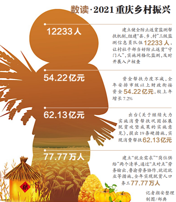 这一年,为做好脱贫劳动力的就业工作,市人社、乡村振兴等部分强化就业监测,在不乱外出务工规模、支持就地就近就业、健全长效机制、加强保障措施等4个方面出台33条政策,确保就业帮扶政策不踩急刹车、不搞一刀切,全力推动巩固脱贫攻坚成果同乡村振兴有效衔接起好步、开好局。截至目前,重庆已有77.77万脱贫人口外出务工,较上年增加1万多人。