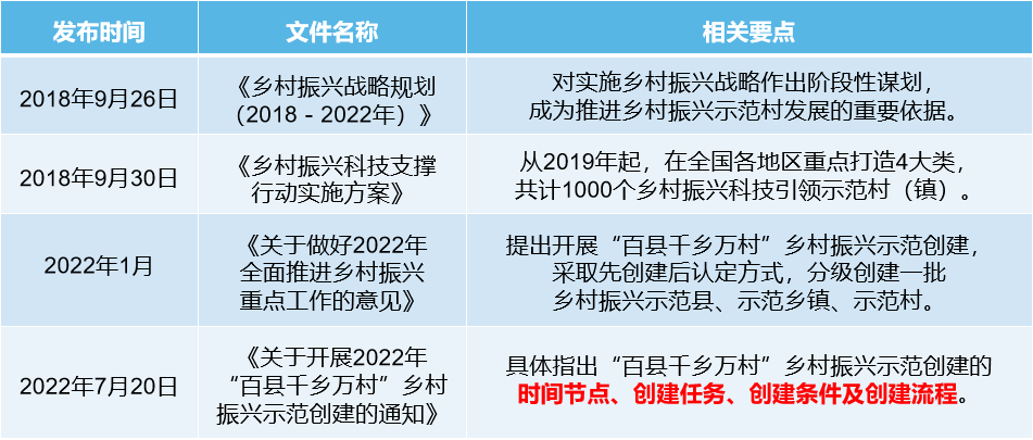 首先我们一起来看一看该项政策从何而来。2022年1月,2022年中心一号文件正式发布,《关于做好2022年全面推进乡村振兴重点工作的意见》明确要开展“百县千乡万村”乡村振兴示范创建,采取先创建后认定方式,分级创建一批乡村振兴示范县、示范乡镇、示范村。