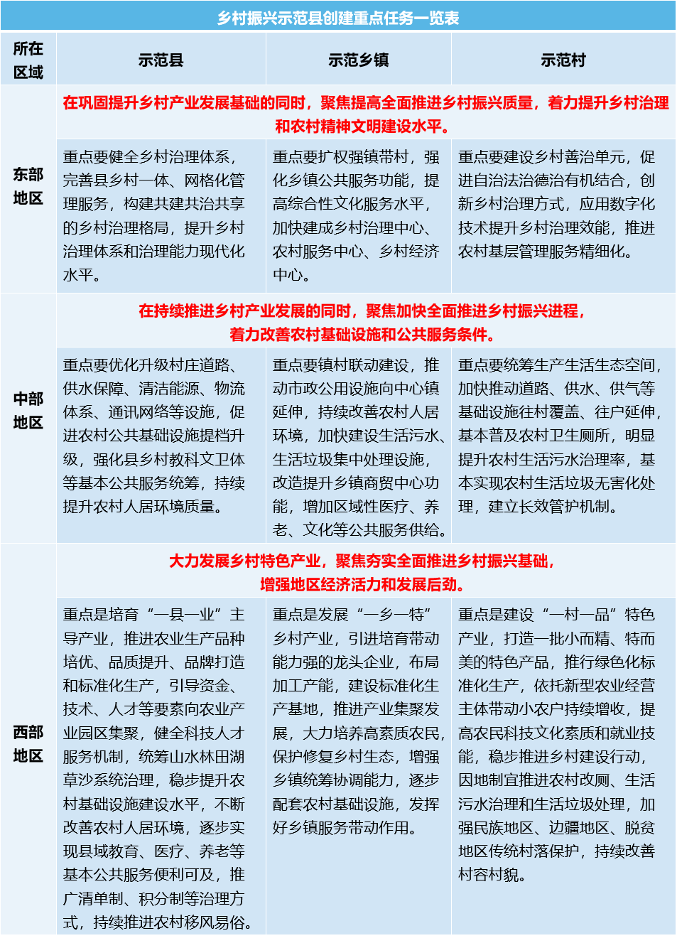 2022年,立足县、乡、村资源禀赋和发展基础,体现东、中、西部区域特色,农业农村部、国家乡村振兴局组织创建100个左右国家乡村振兴示范县。根据所在地区发展程度不同,依托各地发展特点及工作重点,部署不同的创建任务,其中重点任务如下。