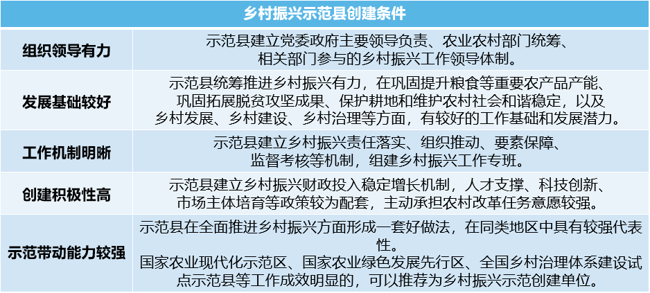 (五)示范带动能力较强。示范县在全面推进乡村振兴方面形成一套好做法,在同类地区中具有较强代表性。示范乡镇、示范村具备可看可学可鉴戒的推广价值。国家农业现代化示范区、国家农业绿色发展先行区、全国乡村管理体系建设试点示范县、全国乡村管理示范村镇、全国锦绣宜居村庄等工作成效显著的,可以推荐为乡村振兴示范创建单位。