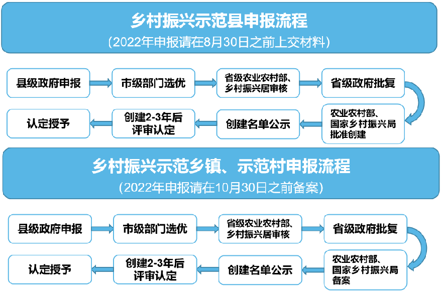 那么当我们知足了前提,该如何申报创建呢?下面我们来看看2022年乡村振兴示范县的申报流程。