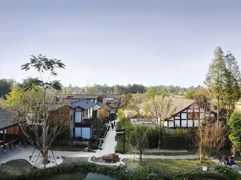 本案着力于对林盘聚落的重塑,从传统林盘聚落中寻找关联,重塑“外放内敛,闲趣雅致”的西蜀民居氛围。首期的设计整体规划延续“随田散居”的川西林盘聚落特征,整体上以“小规模”、“生态化”和“微田园”为主要规划概念和出发点,打造林盘外的田园空间、林盘内的生态空间、院落内的庭院空间的协调发展,形成独特的现代川西林盘聚落。
