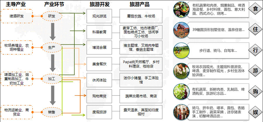 农业各个环节与旅游产品无缝融合,形成紧密亲密联系关系的农旅工业链。