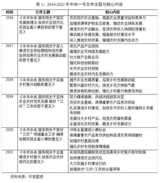 “十三五”时期,我国农业农村发展取得新的历史性成就。农民人均收入较2010年翻一番多,现行标准下农村贫困人口全部脱贫,贫困县全部摘帽,易地扶贫搬迁任务全面完成,消除了绝对贫困和区域性整体贫困,创造了人类减贫史上的奇迹。农村人居环境明显改善,农村改革向纵深推进,农村社会保持和谐稳定,农村即将同步实现全面建成小康社会目标。历年中央一号文件关注的主题均为“三农”问题,从农业基础、农业产业发展、农村改革、乡村建设等角度出发,对我国农村农业发展提出指导意见。一号文件的主题变化反映出我国农业农村发展取得的阶段性成果,也反映了新时代农业农村问题主要关注点的升级与转变。